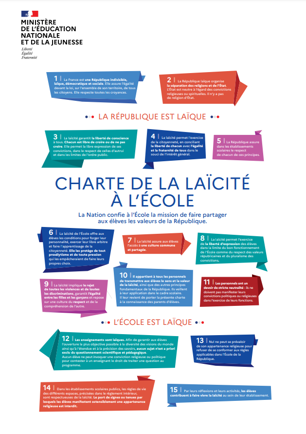 Affiche officielle rappelant les 15 principes fondamentaux de la laïcité à l’École, pour faire vivre et comprendre les valeurs de la République.