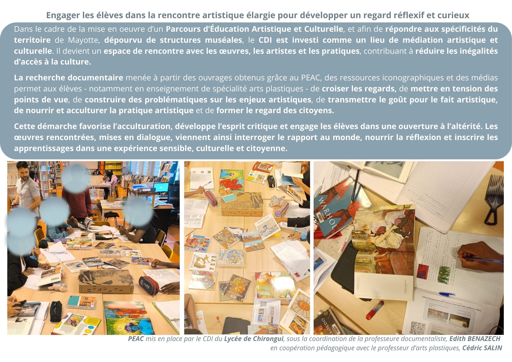 Cette dynamique s’inscrit dans une coopération pédagogique entre la professeure documentaliste et l’enseignant d’arts plastiques, au service de la réussite et de l’ouverture culturelle des élèves.